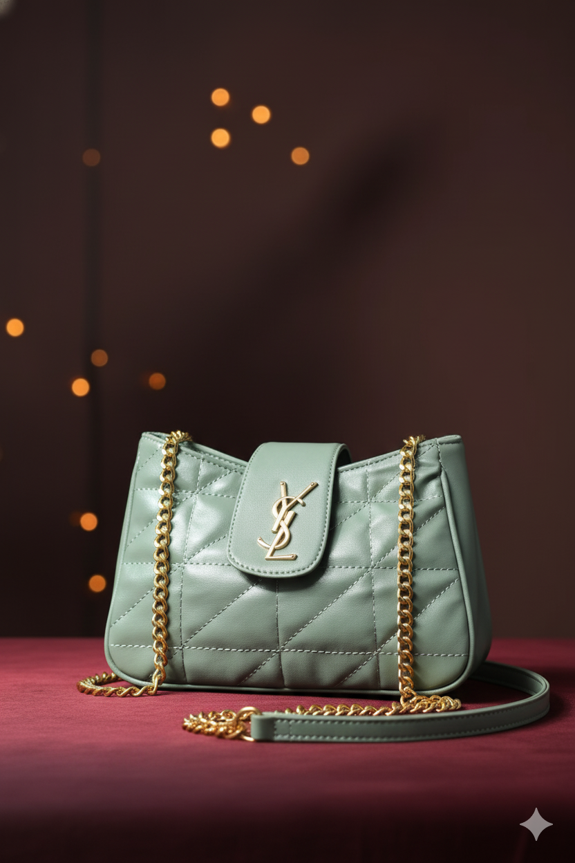 Description: A chic quilted shoulder bag in elegant sage green — perfectly sized for daily essentials with a touch of luxury.